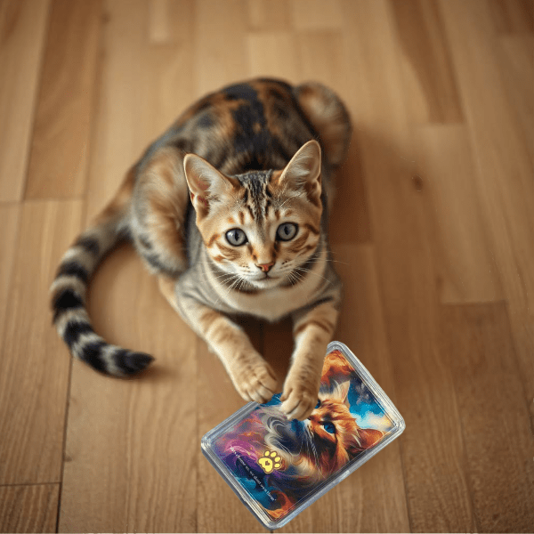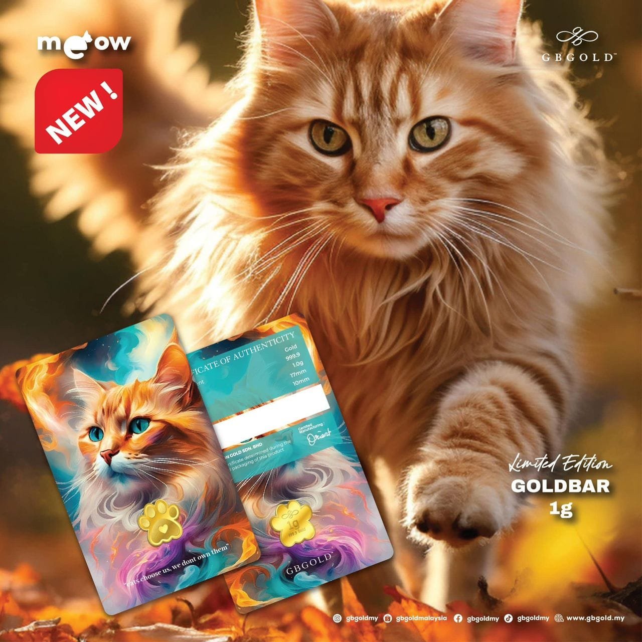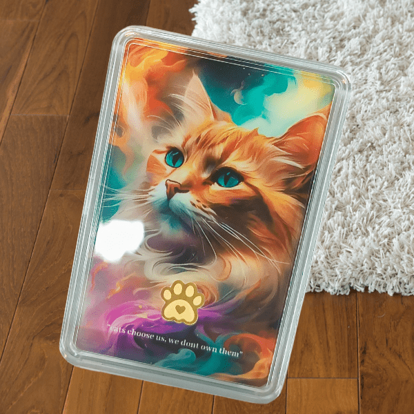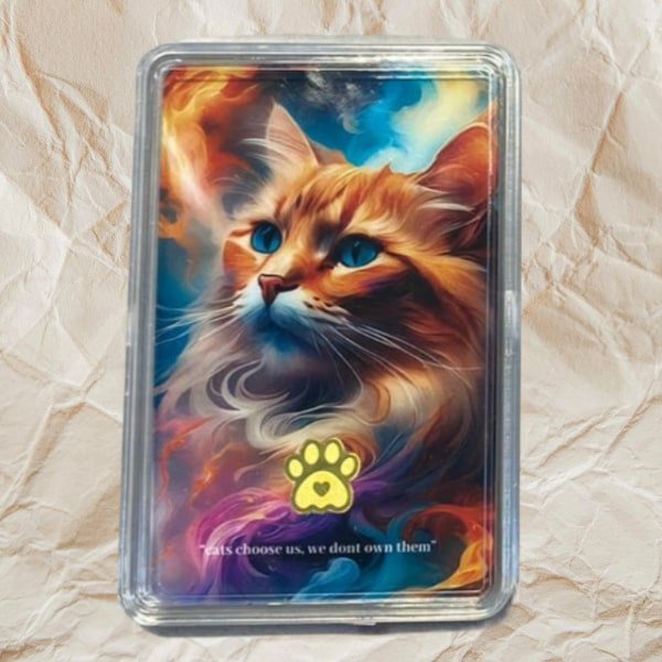 The gold card features a vibrant illustration of a majestic orange cat with piercing blue eyes. The cat is set against a dynamic backdrop of swirling colors and cosmic elements. A cat paw designed gold is embedded on the card, adding a touch of elegance. The card also includes the quote “Cats choose us, we don’t own them” printed in a stylish font. The card is encased in a clear plastic case.