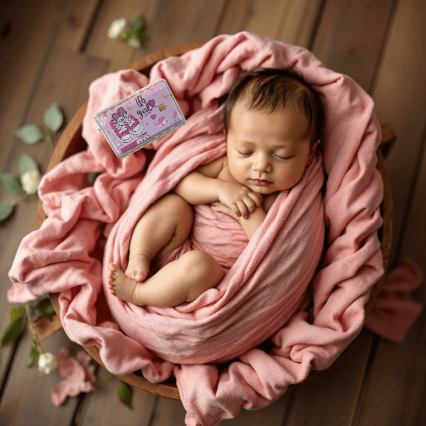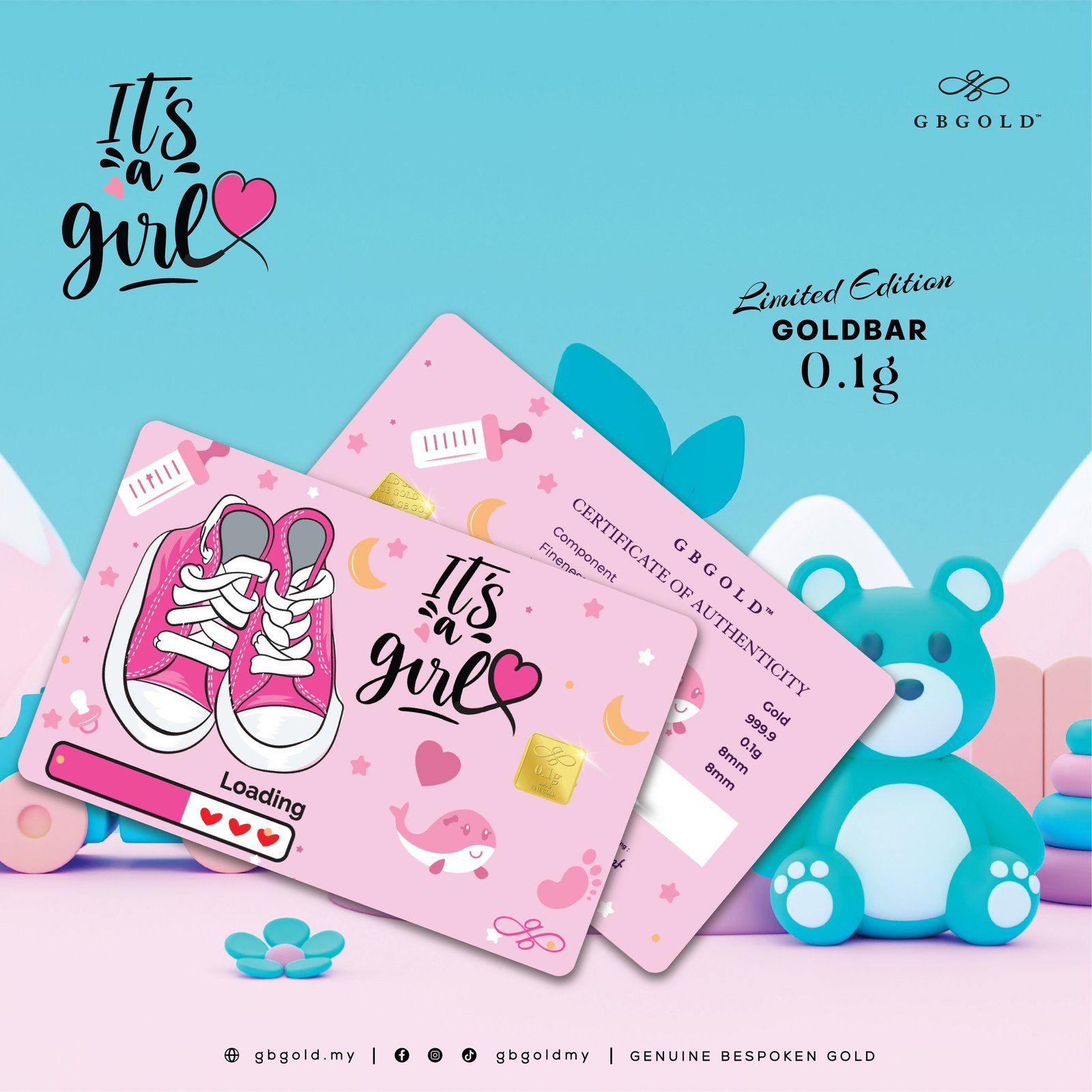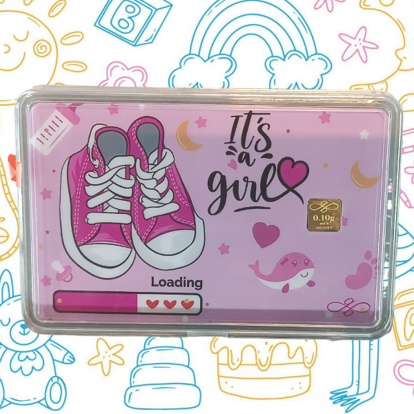 The 0.1g newborn gold card is a baby girl-themed card with a pink background and a playful design. It features a pair of pink sneakers, a baby bottle, a whale, stars, and hearts. The text “It’s a Girl” is written in a whimsical font. The card also includes a “Loading” bar with hearts, indicating the anticipation of the baby’s arrival. The gold bar itself is 0.10g and made of 999.9 fine gold. The card is encased in a clear plastic case.