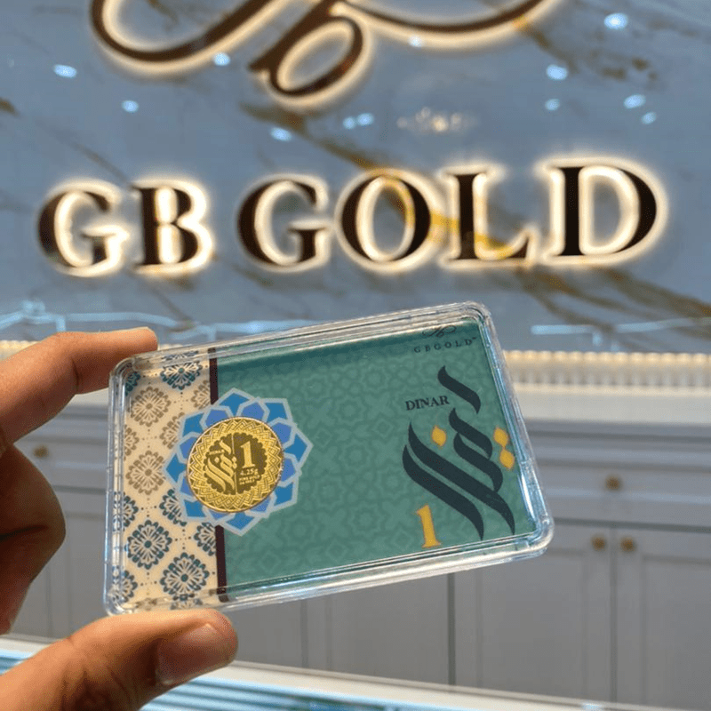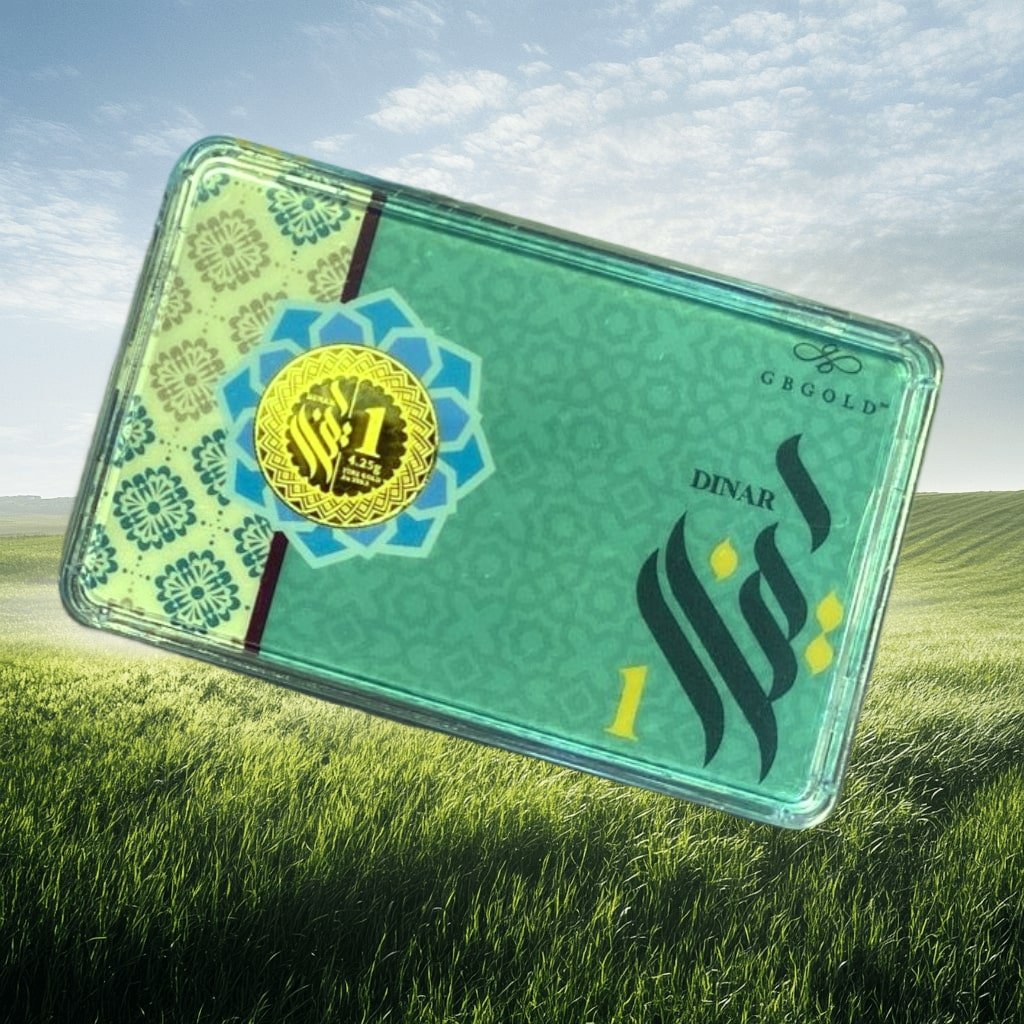 1 dinar is equivalent to 4.25 grams of gold and is made of 999.9 pure gold. The GB Gold Signature 1 Dinar card is turquoise with the word “Dinar” and the number “1” written.