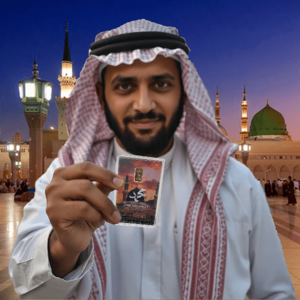 The card showcases a vibrant design of the Nabawi mosque in Madinah, the Arabic calligraphy of “Muhammad”, and the phrase “Jom Selawat!” which translates to “Let’s Recite Selawat!” in English.