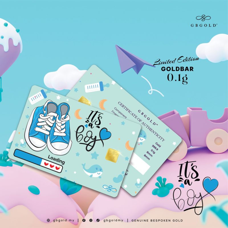 The 0.1g gold card is a baby boy-themed card with a blue background and a playful design. It features a pair of baby blue sneakers, a baby bottle, a whale, stars, and a moon. The text “It’s a Boy” is written in a whimsical font. The card also includes a “Loading” bar with hearts, indicating the anticipation of the baby’s arrival. The gold bar itself is 0.10g and made of 999.9 fine gold. The card is encased in a clear plastic case.