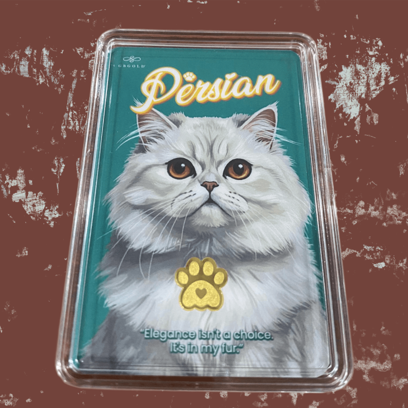 Crafted with meticulous attention to detail, this exquisite gold bar features a heartwarming illustration of a regal Persian cat.