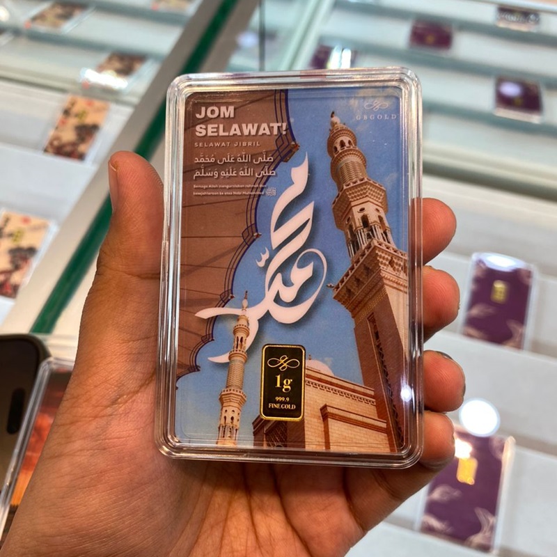 The front of the card features the Nabawi Mosque with its prominent minarets. The words “JOM SELAWAT!” are written in large, bold letters at the top, which translates to “Let’s Recite Salawat!” Below this, “SELAWAT JIBRIL” is written. The Arabic calligraphy for صلى الله على محمد، صلى الله عليه وسلم (“Sal Allahu Ala Muhammad, Sal Allahu Alaihi Wa Sallam”) is prominently displayed, which is the Islamic greeting and blessing upon the Prophet Muhammad.